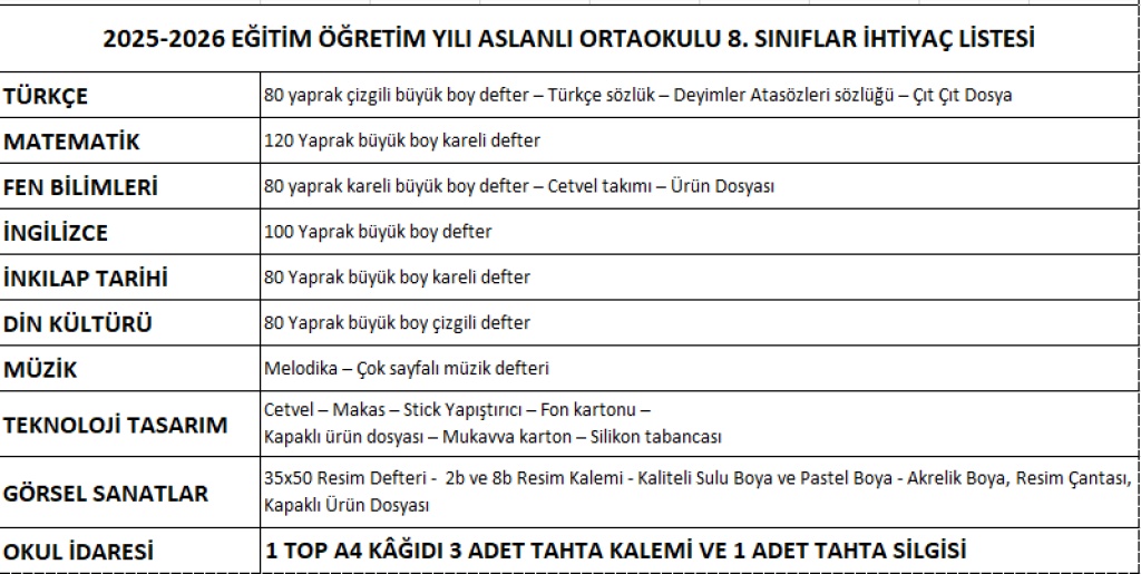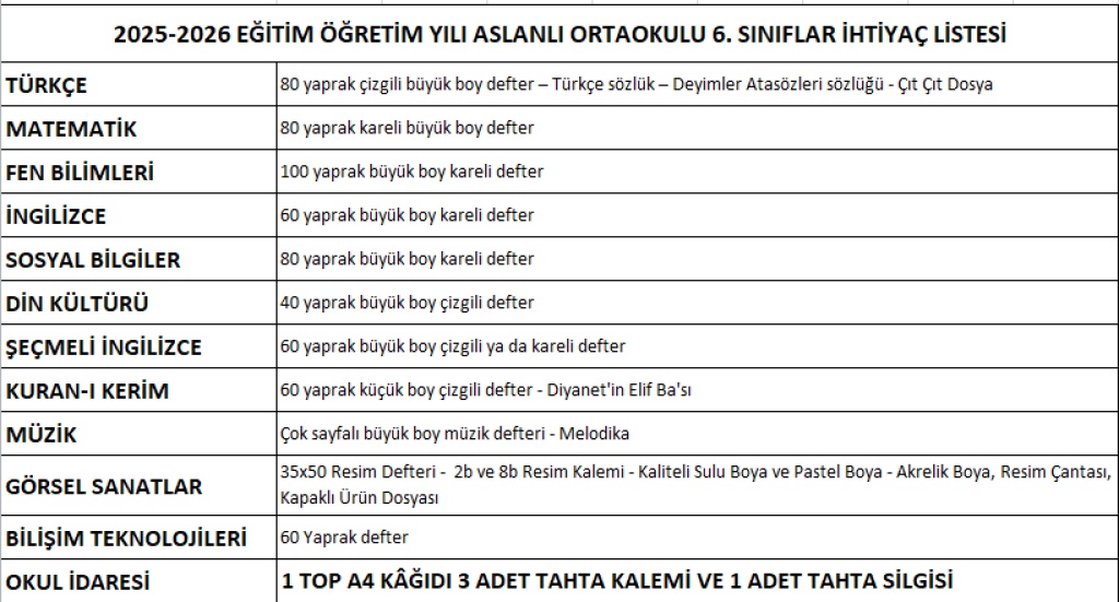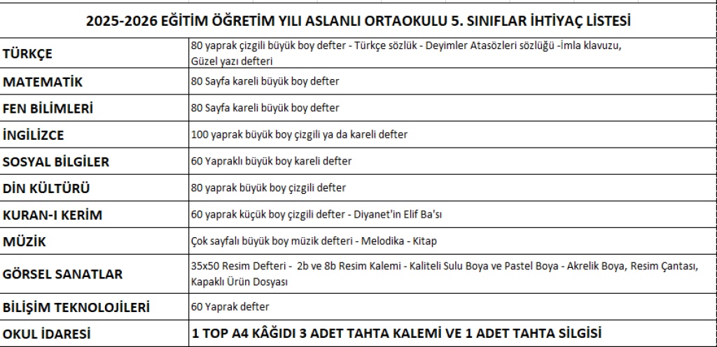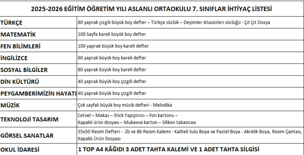 2025-2026 EĞİTİM ÖĞRETİM YILI İHTİYAÇ LİSTELERİ